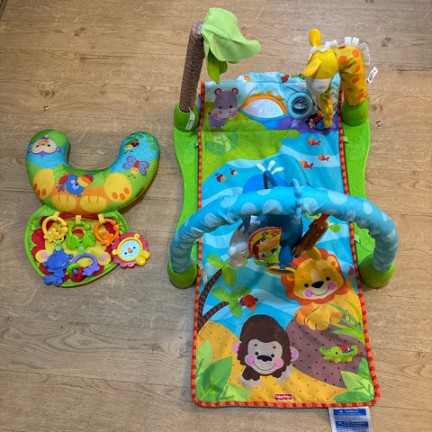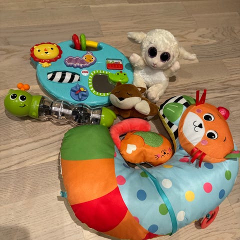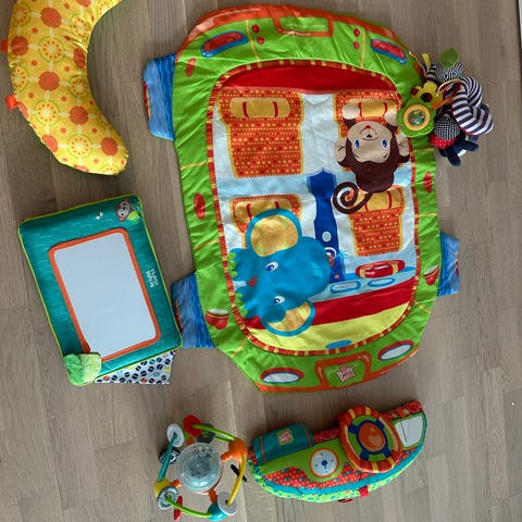 Montessori – lite brukt, som ny. Den knitrer, piper og lager raslelyder. Bladene kan brettes til sidene. Har speil.
