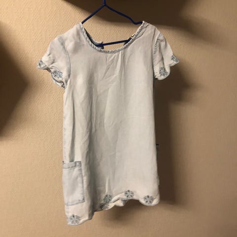 GAP denimkjole for jente i størrelse 92. Kjolen er laget i blå denim og har ermeløst snitt. Rund hals med kontrastfelt i lysere denim og knapper på skuldrene. Rett fasong med enkle sømdetaljer og stikklommer i sidene. Passer til hverdagsbruk og kan kombineres med genser eller tights etter behov.
