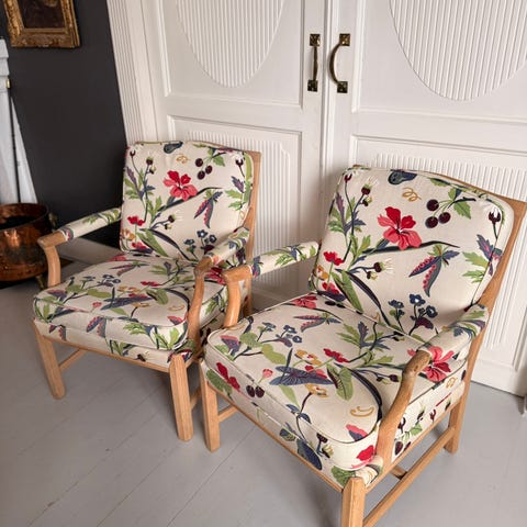 Gripsholm-stolen «Ellinor» fra Bröderna Anderssons møbler med et nydelig og luksuriøst kretong fra GP & J Baker. Rustrødt i bunn med pelikanmotiv.