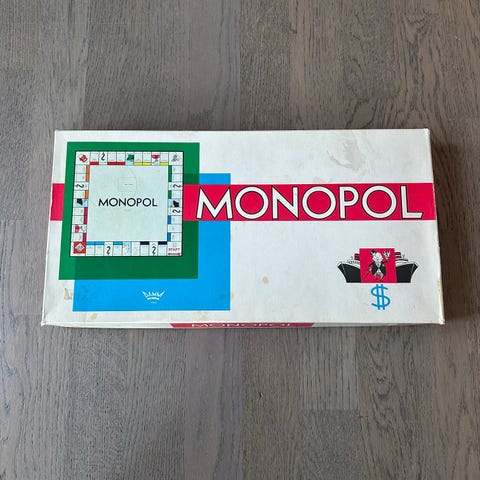 Komplett spill i pent brukt stand med hel eske, spilleregler, tykt og solid spillebrett, to terninger, hele og pene sedler og kort, hus, hotell og biler. "Deres hus og hoteller brenner" er selvfølgelig inkludert.