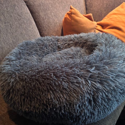 Pelsbarn hundeseng og sofa-beskytter for små kjæledyr. Ytre størrelse er 100 x 85 cm og innvendig liggeflate er 72 x 72 cm. Sengen har høy kant rundt tre sider som gir støtte til dyret og fungerer samtidig som beskyttelse for sofaen. Myk, pelslignende overflate i mørk grå farge gir et lunt underlag for hund eller katt. Egnet for mindre raser og andre små kjæledyr som liker å ligge i sofaen.