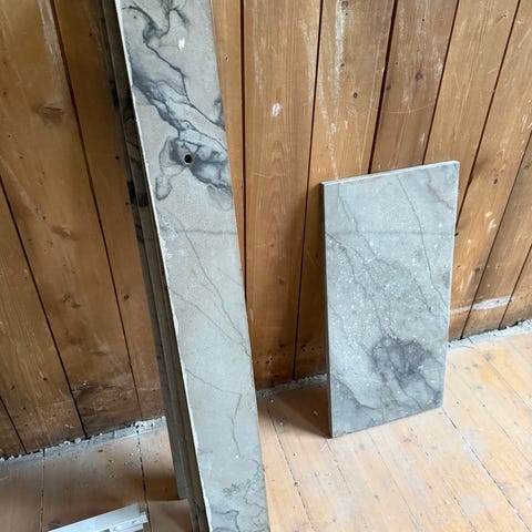 Vedovn med klebersteinsomramming i grå marmorert utførelse. Ovnen har front av støpejern med flere dører for fyringsrom. Høyde 104,5 cm, bredde 90 cm og dybde 44 cm. Må demonteres.