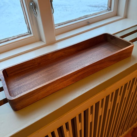 Et stilrent og håndlaget oppbevaringsbrett i tre, perfekt til fjernkontroller på stuebordet, men også fint til lys, dekor, nøkler eller andre småting du vil ha samlet og ryddig.