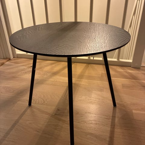 Lite sofabord fra Jysk gis bort. Noen små skader på bordet, se bilde. 55 cm diameter og 45 cm høyt. Må hentes.