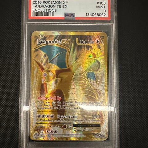Pokémon XY Evolutions Dragonite EX samlekort. Kortet er fra 2016-utgaven av XY Evolutions-serien og viser Dragonite EX i fullart-design med gullfarget holografisk motiv. Kortet er gradert av PSA med karakteren 6 (EX-MT) og leveres innkapslet i offisiell PSA-holder med serienummer 137415029. Egner seg som samlekort for Pokémon TCG-samlere og som del av et XY Evolutions-sett.