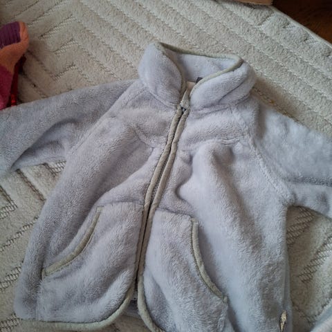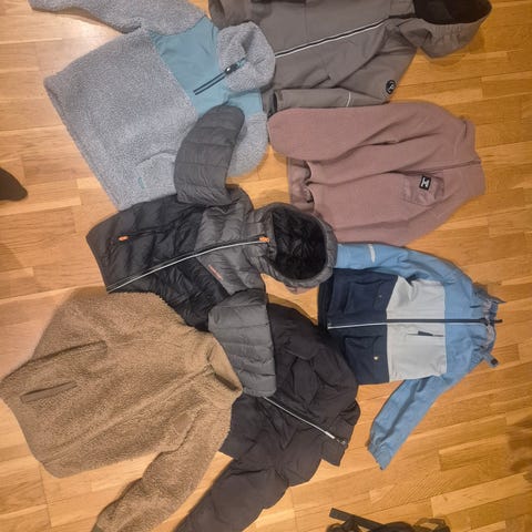3 tykke jakker, en tynn og en i fleece med mamseører. En heldress som man kan brette ut i votter og føtter.