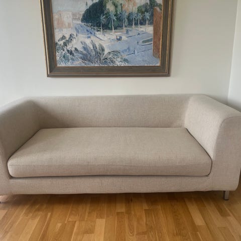 2 sofaer: 3 1/2 seter (220cm) og 2 seter (174cm). Tåler det meste. Løse og vendbare puter som kan vaskes/renses. Farge : varm grå. Meget slitesterk. God størrelse for 4 + 2 personer. Behagelig å slenge seg ned i foran tv eller med en god bok.