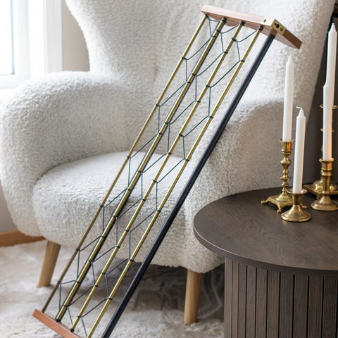 Teak hattehylle/klehylle frå 1960-70-talet. Horisontale stenger i i messing og svart metall med svart nettingmønster mellom og kleskrokar i messing.