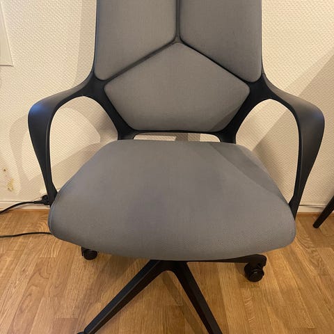 Den selges rett og slett fordi den tar litt for mye plass på hjemmekontoret mitt, da jeg har en fryser rett bak stolen. Skal bytte ut med en helt uten ryggstøtte.