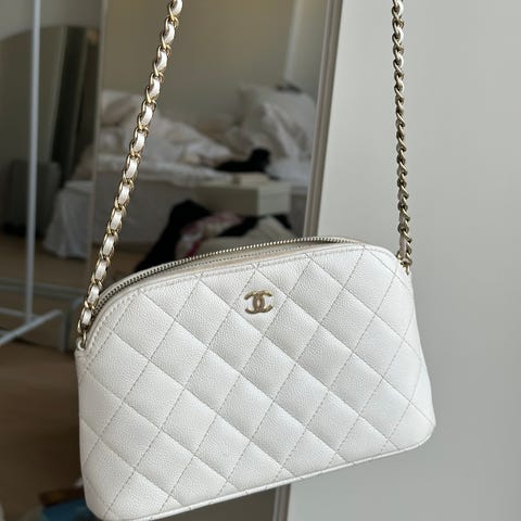 YSL skulderveske for dame i lær. Vesken er i en lys beige farge med quiltet mønster og har metallogo i front. Den har skulderrem i kombinasjon av kjede og lær, og innvendig finnes kortlommer og åpent hovedrom. Egnet til hverdagsbruk og enklere anledninger der det er behov for å ha med nødvendigheter som mobil, nøkler og små personlige eiendeler.