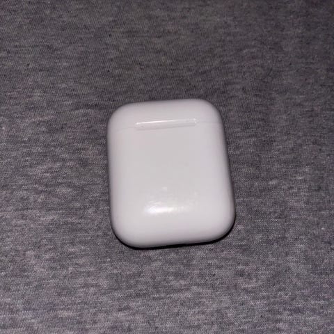 Apple AirPods trådløse ørepropper i hvit farge med ladeetui. Øreproppene kobles trådløst til kompatible enheter via Bluetooth. Synlig brukt, se bilde.
