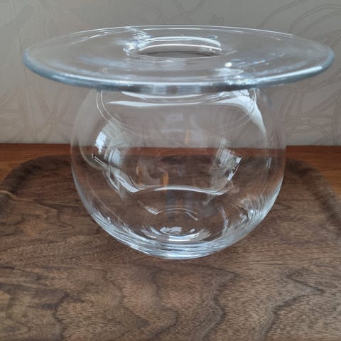 De er i klart glass. Bred kant rundt toppen gir blomstene et pent løft.