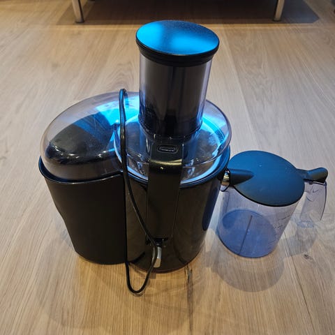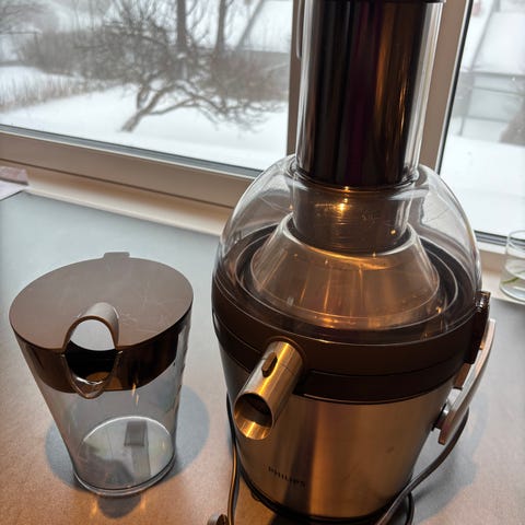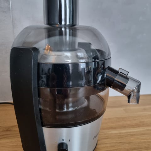 Philips juicepresse i rustfritt stål med beholder og lokk. Maskinen har påfyllingsrør på toppen og tut i front for tapping av juice direkte i muggen. Beholderen er gjennomsiktig slik at innholdet er lett å se. Juicemaskinen er egnet til pressing av frukt og grønnsaker til juice i hjemmet. Leveres med tilhørende mugge