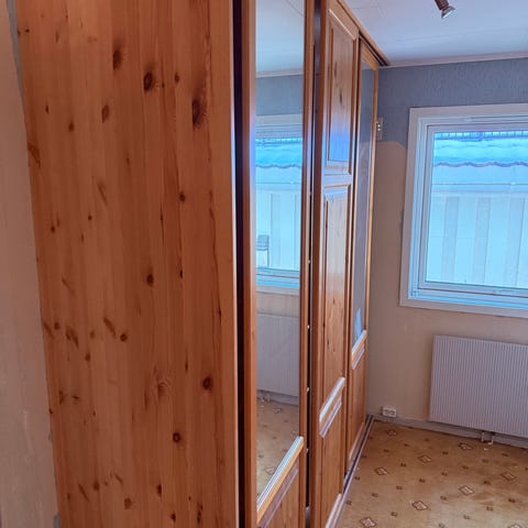 Skyvedørsgarderobe med tre dører, en dør med speil og to i tre med metallramme rundt.