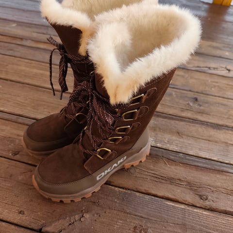 Okaki vinterstøvler i størrelse 37. Støvlene er svarte med snøring foran og grov yttersåle som gir godt grep. Overdelen er i tekstil og syntetisk materiale, og skaftet har myk, pelsliknende fôring øverst for ekstra komfort rundt ankelen. Passer som varme og praktiske vintersko til hverdagsbruk. .kun brukt 3 ganger pga for stor