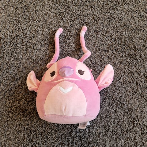 Squishmallows kosedyr i myk plysj med galakseinspirert flerfarget mønster i lilla, rosa, blå og hvite toner. Figuren har en lys mage, brodert ansikt og lilla hatt med to antenner. Passer som kosedyr, pyntepute eller samlerfigur for barn og andre som liker Squishmallows.