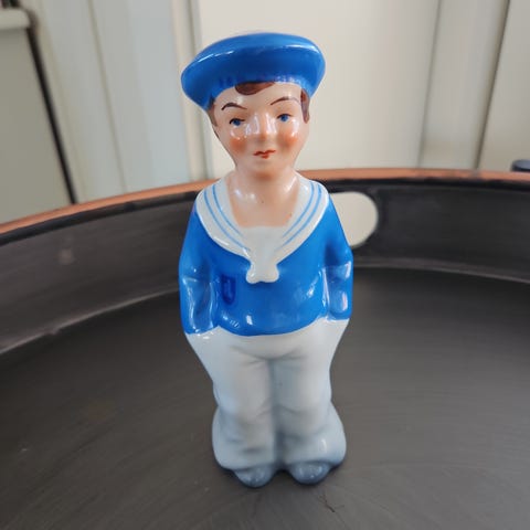Vintage karaffel som forestiller en sjømannsgutt i blå sjømannsdrakt med hvite og gule detaljer. Figuren sitter med en livbøye foran seg og har lue på hodet. Ukjent produsent og alder