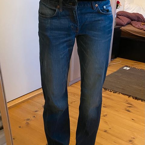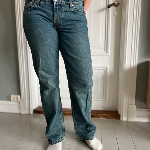 Arrow low straight jeans fra weekday, størrelse W24 L30. Den er sydd igjen bak (bilde nr 3) men det synes ikke godt, bortsett fra det så har den ingen bruksmerker eller slitasjer.