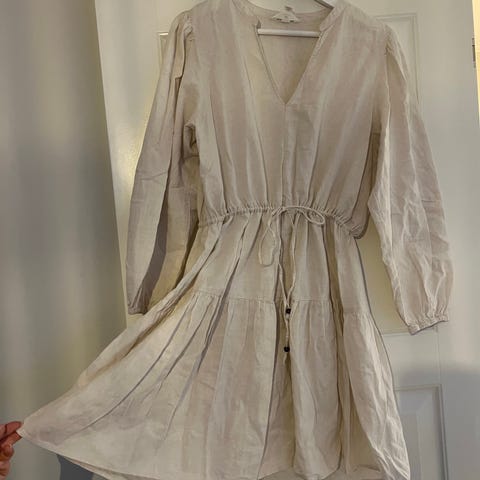 Selger en Hale Bob sommerkjole for dame i størrelse M. Kjolen er hvit og laget i 100 % bomull. Modellen har lange ermer med strikk ved håndleddene, v-utringning og innsvinget liv. Glidelås i siden. Egnet som sommerkjole.