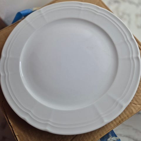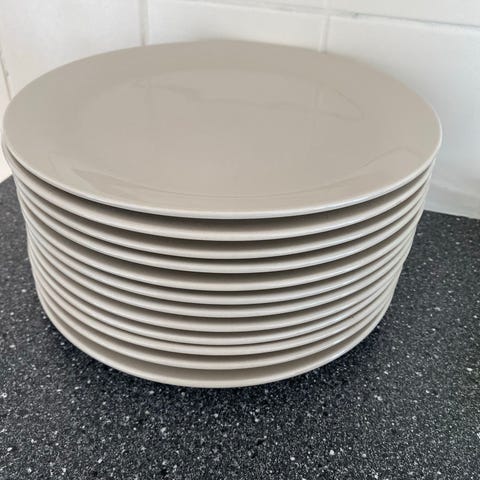IKEA tallerkener i hvitt porselen. Flere ulike tallerkentyper vises på bildene, blant annet middagstallerkener og mindre tallerkener med forskjellige mønstre langs kanten. Nøytral hvit farge som passer til de fleste serviser og borddekkinger. Egnet til daglig bruk på kjøkken og spisestue.