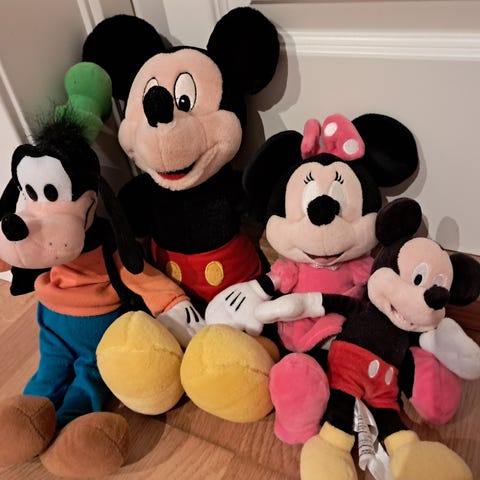 Disney Mikke Mus og Minnie Mus kosedyr. Myke plysjfigurer med klassisk utseende, Mikke med rød bukse og gule sko, Minnie med rød kjole, som har blitt noe slapp i strikken (derfor jeg ikke har satt «som nye» i annonsen, ellers feilfrie) med hvite prikker og matchende sløyfe. Egnet som kosedyr eller dekor på barnerom. Laget i mykt plysjmateriale.