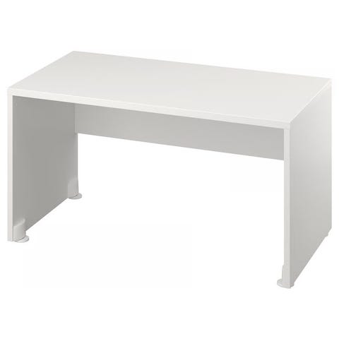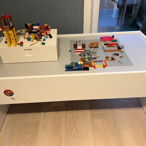 IKEA lekebord med oppbevaring i hvit utførelse. Bordet har en grå toppflate som kan skyves til side for å gi tilgang til oppbevaringsrom under. Egnet som aktivitetsbord for barn, for eksempel til lek, tegning eller byggesett, samtidig som leker og utstyr kan oppbevares i rommene under bordplaten. Bordet er laget i trebasert materiale med glatt overflate som er enkel å tørke av.