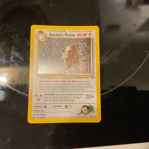 Pokémon Giovanni’s Nidoking samlekort. Kortet viser Pokémon-figuren Giovanni’s Nidoking fra Pokémon Trading Card Game. Forsiden har illustrasjon av Giovanni’s Nidoking med kortinformasjon som HP, angrep og korttekst. Baksiden har standard Pokémon-logo og pokéball-design. Egnet for samling eller som del av et Pokémon-kortspillsett.