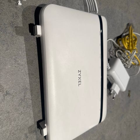 Zyxel router i hvit farge. Enheten har flere Ethernet-porter på baksiden for kablet tilkobling av nettverksenheter, samt tilkobling for strøm og nettverkskabel. Egnet som sentral enhet for hjemmenettverk eller mindre kontor, med mulighet for både trådløs og kablet bruk avhengig av modellens funksjoner. Passer til tilkobling av PC, TV, spillkonsoll og annet nettverksutstyr via ruterens porter.