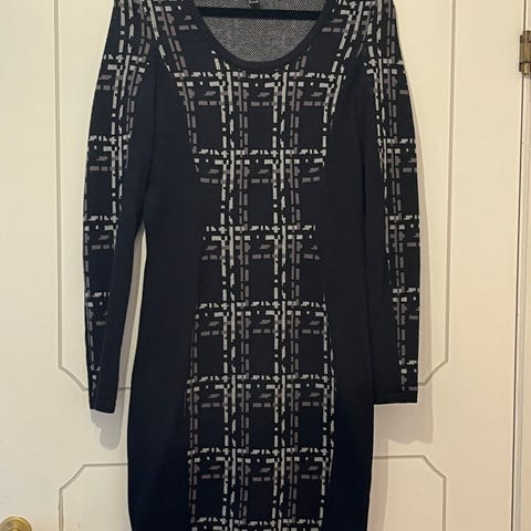 Kjolen har lange ermer og dekorative blonder/struktur i overdelen og langs sidene. Kontrastfeltene går på tvers over bryst og hofter, samt ned langs sidene, noe som gir et markert mønster. Lengden er knelang til legg-lengde (se bilder for inntrykk av passform og lengde).