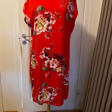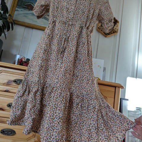 Cream hverdagskjole i størrelse 44 for dame. Kjolen er flerfarget med mørk bunnfarge og lyse kontrastfelt/detaljer.