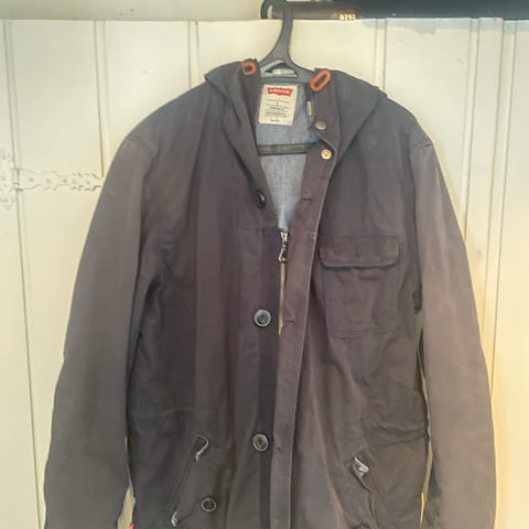 Levi's jakke for herre i størrelse L. Lengre variant som når meg på 174 til ca midt på låret. Passer som ytterjakke i overgangssesonger eller milde dager. 100% bomull med kordfløyel krage og mansjett. Kjøpt ny i 2023, og brukt svært lite da den er litt for stor.