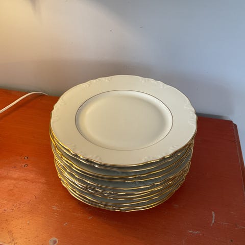 Vakkert middagsservise gitt som bryllupsgave i 1964. Stemplene viser at delene er produsert i ulike årstall (se bilder for eksempler). Delene har gråsvart mønstret bord med noe som ligner kroner / små vifter og en gullkant ytterst. Serviset er svært pent behandlet og fremstår deretter, men enkelte deler har selvsagt små bruksmerker i gullkanten og glasuren. Det har tross alt vært brukt til jul og ved andre høytidelige anledninger.