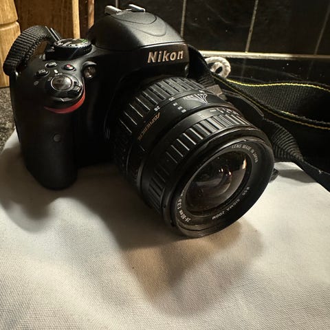 Nikon speilreflekskamera med utskiftbar optikk. Pakken inkluderer kamerahus, flere objektiver med ulike brennvidder samt Nikon-batterilader. Objektivene dekker blant annet zoomområdet fra vidvinkel til tele, egnet for variert fotografering som hverdag, reise og natur. Kameraet har bakskjerm for visning av bilder og menyinnstillinger, samt festepunkt for kamerastropp. Systemet er kompatibelt med Nikon F-fatning for objektiver som passer til denne typen kamerahus.