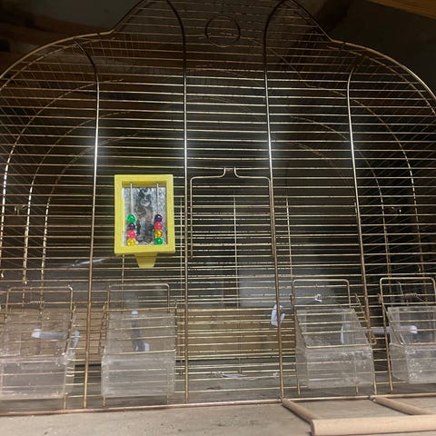 Gis bort. Har stått på loftet lenge og trenger en vask - ellers i helt fin stand og med tilhørende mat og vannskåler.