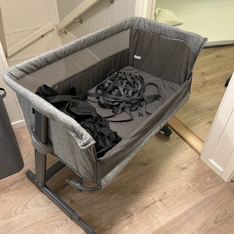 Joie bedside crib babyseng i grå tekstil. Sengen er beregnet som sideseng ved voksenseng, med nettingpaneler på sidene for lufting og innsyn. Stabil ramme med fire ben og rektangulær liggeflate med madrass. Egnet for spedbarn i den første perioden, der barnet kan ligge nært foreldre samtidig som det har egen seng. Passer til bruk på soverom ved siden av vanlig seng.
