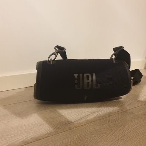 JBL bærbar Bluetooth-høyttaler i svart farge. Kompakt modell med bærestropp på siden for enkel transport. Høyttaleren har kontrollknapper på toppen for blant annet av/på, volum og Bluetooth-tilkobling. Egnet for trådløs avspilling av lyd fra mobil, nettbrett eller andre enheter med Bluetooth-støtte.