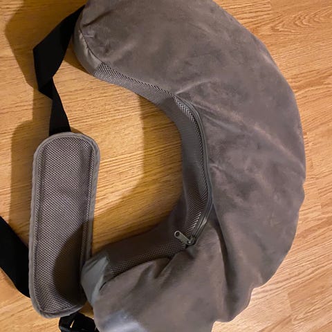 Cozyfix ammepute med buet fasong som legges rundt kroppen og festes med justerbar stropp med klips. Den gir støtte for baby og forelder under amming eller flaskemating. Yttermaterialet er tekstiltrekk, og puten har bærehåndtak for enklere håndtering og oppbevaring.