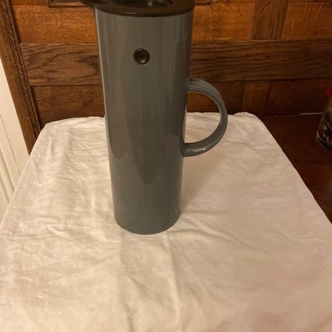 Stelton EM77 termokanne på ca. 1 liter i grå farge. Kannen har sylindrisk design med hank på siden og helletut med lokk. Egnet til servering og oppbevaring av varme eller kalde drikker på kjøkken, spisebord eller kontor.