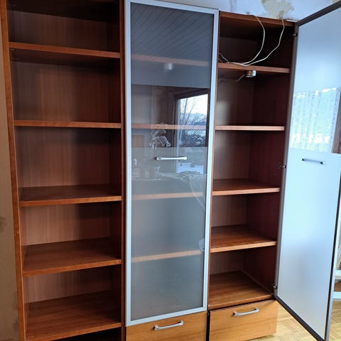 To skapaeksjoner todelt med glassdør og hel dør. To hyller i mellom skapene. Skapene har hver enkelt bredde på 46 cm. Hylle lengden er 111 cm. Total bredde på 203 cm. Det er to glasshyller i skapene med glassdører, det samme i skapene med hel dør. Se bilder.