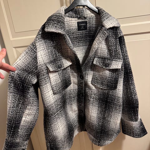 Lindex jakke for dame i størrelse L. Jakken er grå og laget i ullmateriale. Modellen har krage, knapper i front og skrålommer i sidene. Rett og noe kortere passform med senkede skuldre. Egnet som ytterjakke i overgangssesonger eller som et ekstra lag over andre plagg.