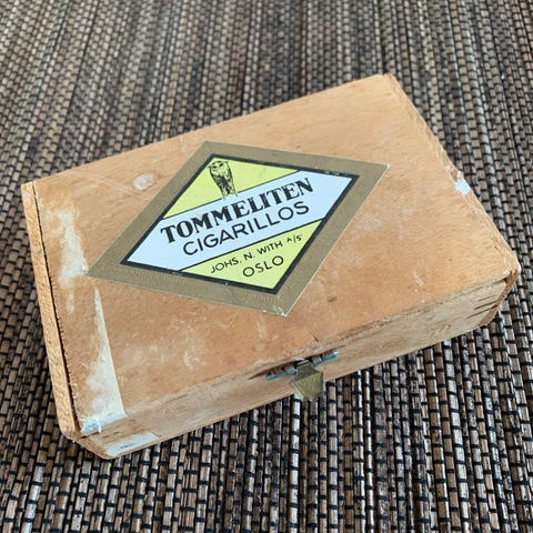 Eldre morsom treleke i eske, ser ubrukt ut.