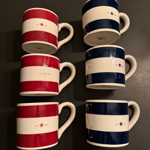 Lexington servise bestående av krus og tallerkener med stjernemønster. Krusene har brede striper i lyse farger og liten stjerne på midten. Tallerkenene er lyse med enkel stjerne i sentrum og markert kant. Passer til bruk i kjøkken og spisestue til frokost, kaffe eller andre måltider. Materiale fremstår som keramikk/steintøy basert på utseende på bildene.