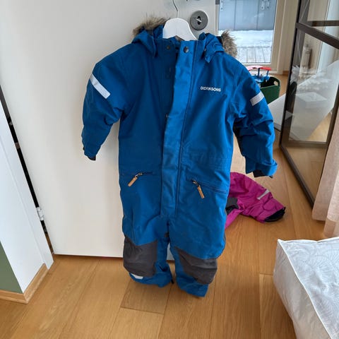 Didriksons vinterdress i størrelse 110/116 for unisex barn. Dressen er blå og laget i polyester. Den har hette med fuskepelskant, forsterkede partier på knær og bak, samt refleksdetaljer. Det er elastikk og fotstrikker nederst på bena for å holde dressen på plass. Dressen har flere lommer foran og er merket som vanntett på innsiden. Brukt av 1 barn 1/2 sesong. Veldig god og varm dress.