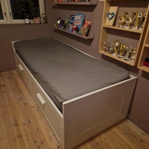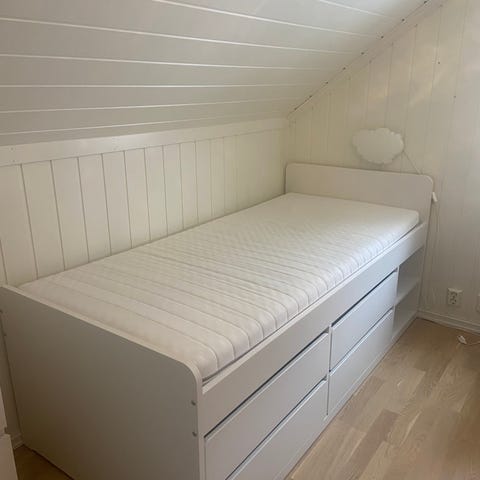 Bohus seng med skuffer i hvit utførelse. Sengen har integrerte oppbevaringsskuffer langs siden, med håndtak i metall. Utførelsen er i lys, malt tre/plateverk som passer inn på barne- eller ungdomsrom, gjesterom eller soverom der det er behov for ekstra lagringsplass til sengetøy, klær eller leker. Rygg- og fotende er rette og gir en enkel, moderne stil. Madrass kan følge med om ønskelig