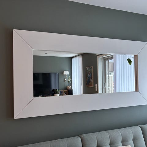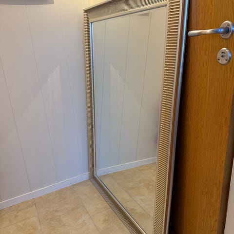 IKEA speil med rektangulær ramme i sølvfarge. Speilet har en profilert ramme rundt hele kanten og kan brukes i gang, stue, soverom eller andre rom der det er behov for et større veggspeil. Egnet til oppheng på vegg.