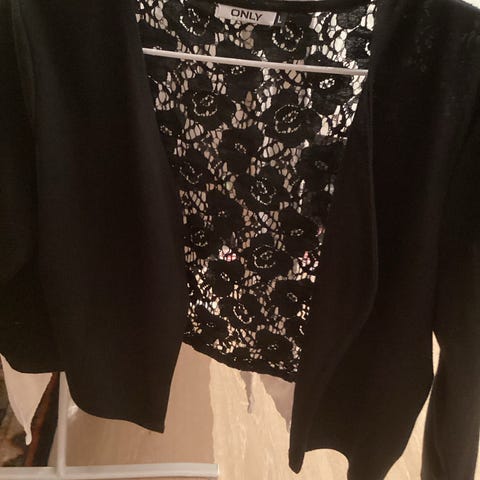 1. Svart overdel med blonder i ryggen. Myk og 100% tynn bomull med 3/4 erm. Str. XL (passer også L). Kr. 120,-