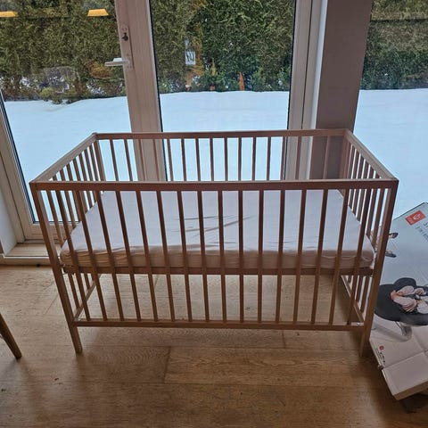 IKEA sprinkelseng i hvit farge. Klassisk barneseng med sprosser på alle sider. Egnet for små barn som trenger trygg soveplass i barneseng med sprinkler. Sengen har rektangulær form og passer standard madrass til sprinkelseng. Materiale er malt treverk. Kan plasseres inntil vegg eller fritt i rommet etter behov. Det følger med beskyttelse så barnet ikke setter foten fast mellom sprinklene, trengs en vask. Må kjøpe ny madrass da den jeg har i senga nå er litt for smal.