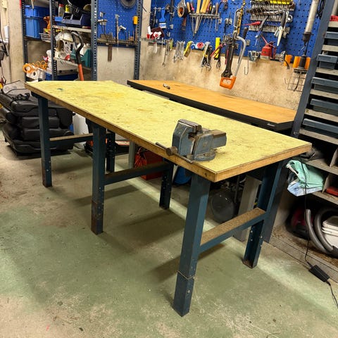 L1 Berner arbeidsbenk med skuffer og skap. Benken har solid treplate som arbeidsflate og understell i blått metall. Under platen er det integrerte oppbevaringsløsninger i form av skap og skuffer på begge sider, samt tverrstag for ekstra stabilitet. Egnet som arbeidsbenk i verksted, garasje eller hobbyrom der det er behov for en robust arbeidsflate kombinert med oppbevaring av verktøy og utstyr.
