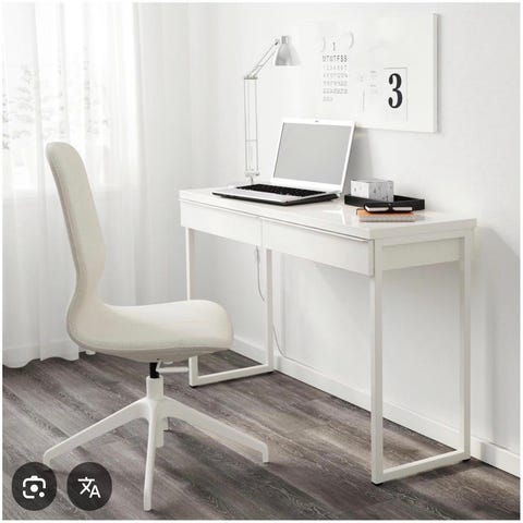 Hvit sminkebord fra IKEA med glass plate på toppen og en skuffe til oppbevaring.