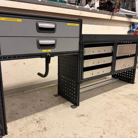 Innredning til bil med 6 skuffer.